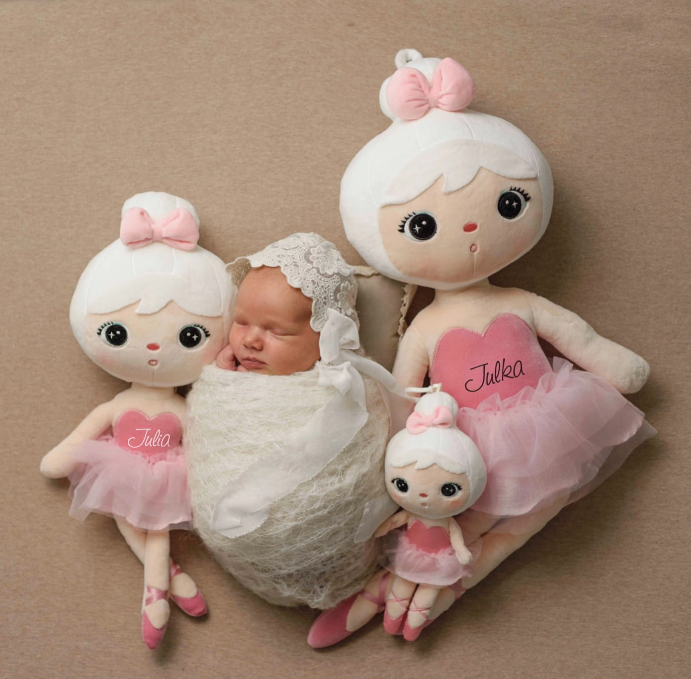 Przytulankę Baletnicę możemy na życzenie spersonalizować. Na body według Państwa preferencji zostanie umieszczone dowolne imię dziecka w wybranym przez Państwa kolorze. Wielkość imienia zależy od jego długości.