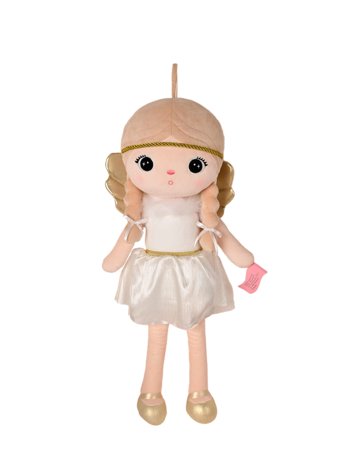 Na jej strój składa się tiulowa zdejmowana spódniczka, złote skrzydełka i balerinki, futrzany kołnierzyk i białe body. Laleczka wykonana jest z milutkiego pluszowego materiału.