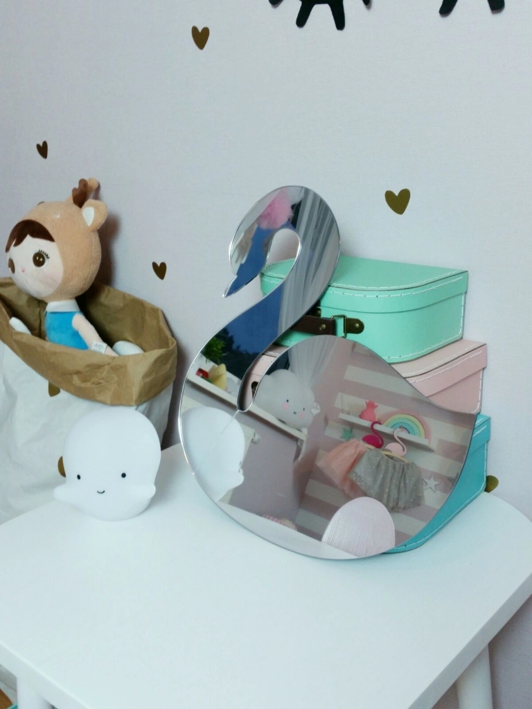 Lekkie, nietłukące się, akrylowe lusterko w kształcie pięknego łabędzia, do powieszenia na ścianie za metalowy haczyk. Piękna i zabawna dekoracja pokoju.