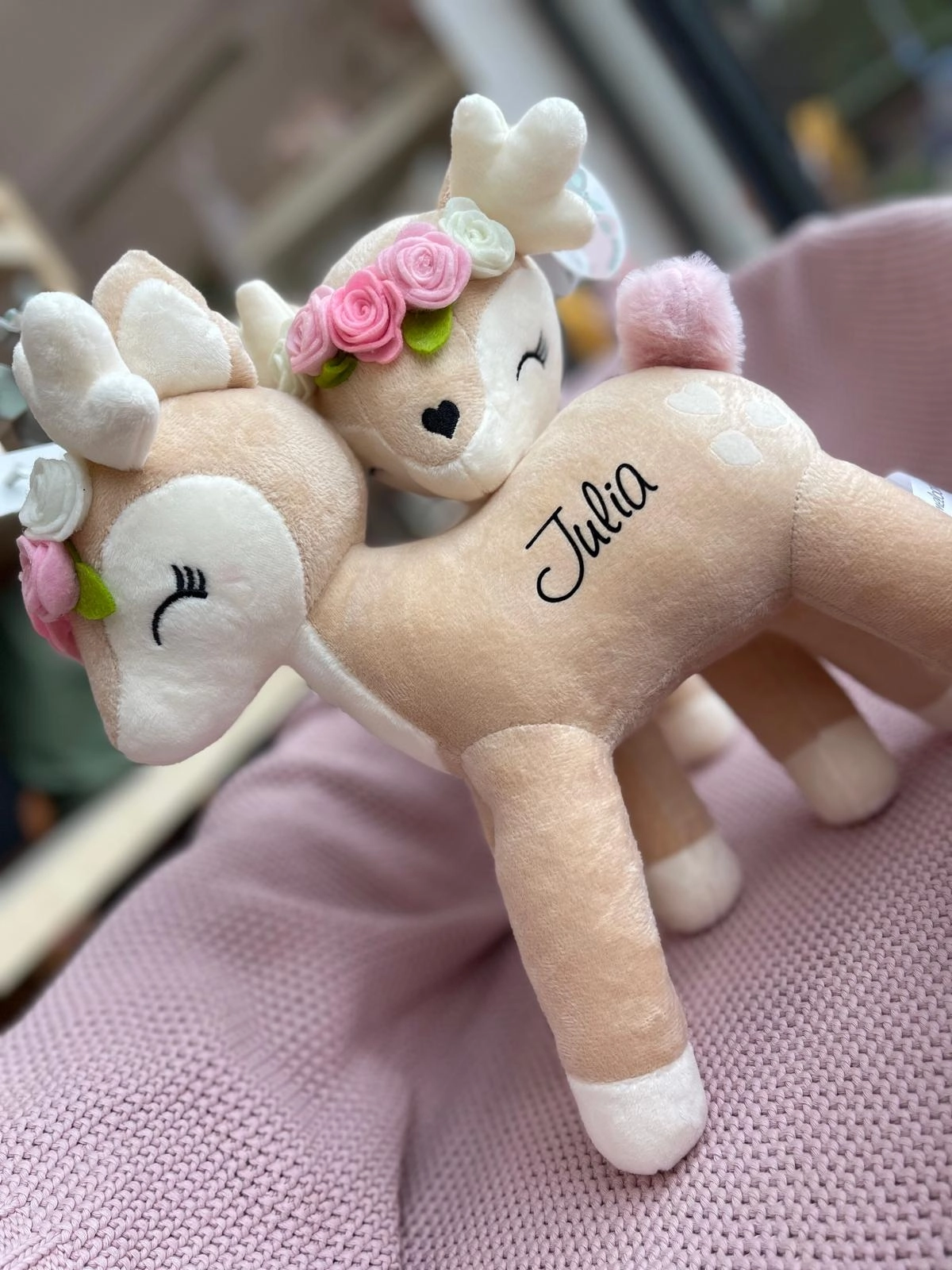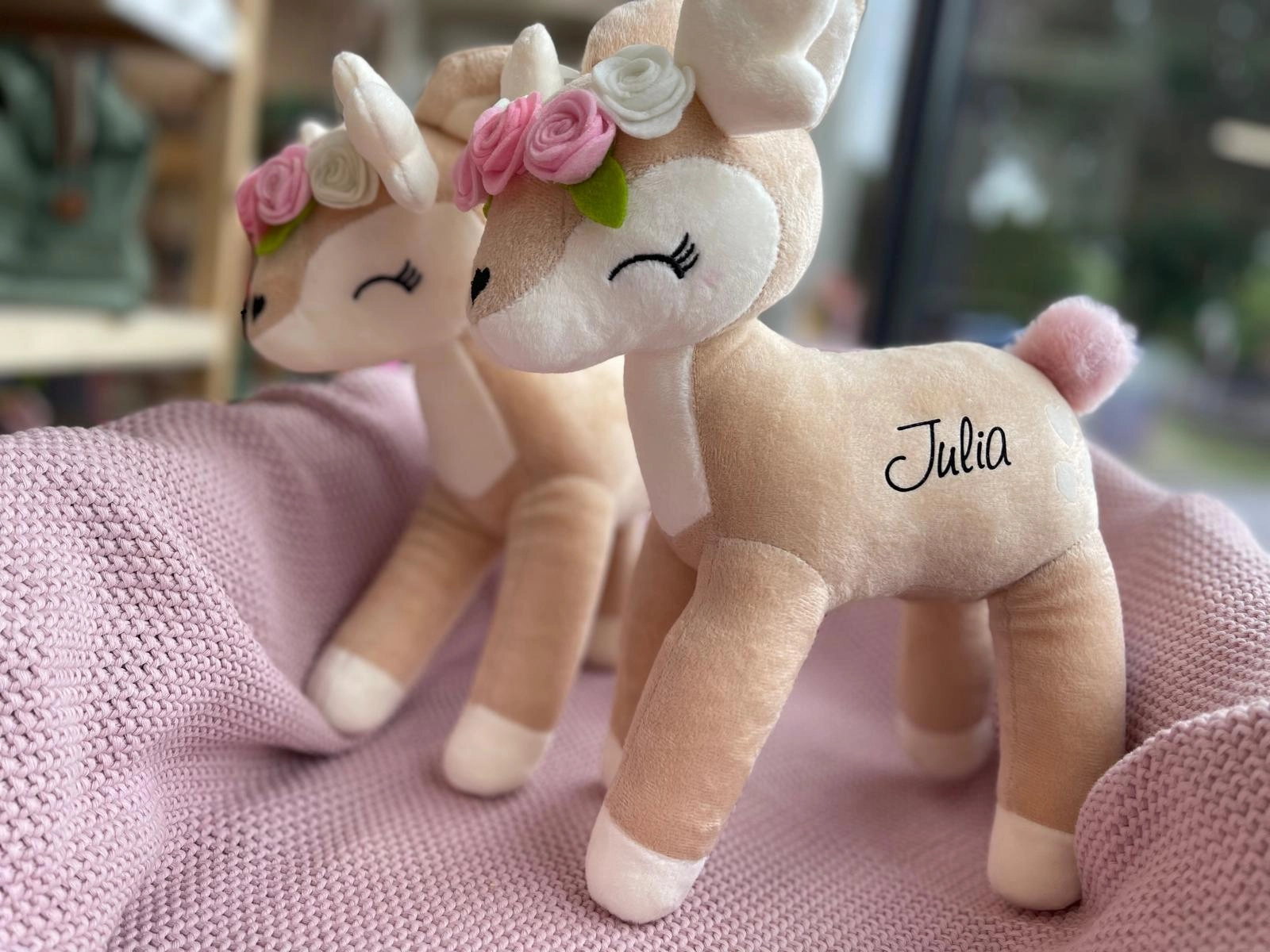 Pluszowa sarenka z kwiecistym wianuszkiem firmy Melootka w pastelowych kolorach to przesłodka przytulanka dla małej dziewczynki.