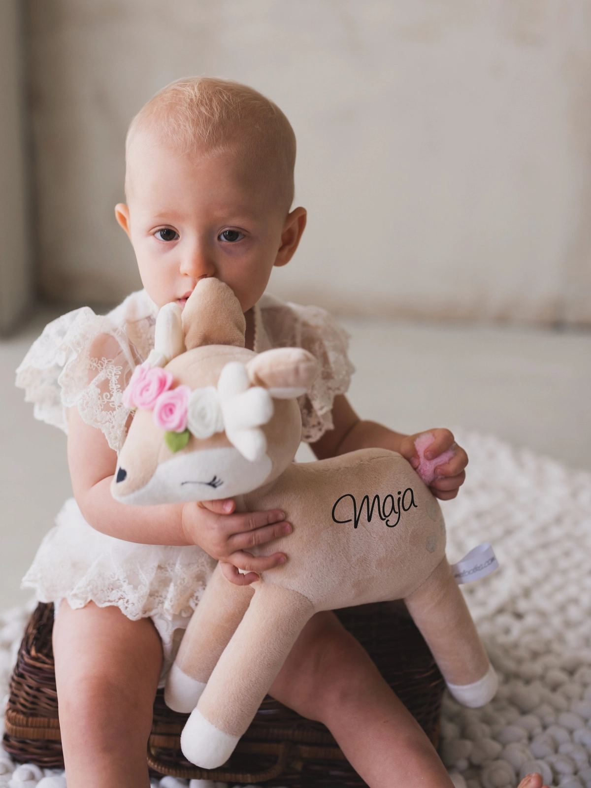 Sarenka szybko stanie się ulubioną maskotką, ponieważ jest milutka i łatwa do trzymania w rączce małego dziecka. Posiada wszystko to co kochają małe dziewczynki. Śpiące oczka i nosek- serduszko sprawią, że ta przytulanka stanie się najlepszą przyjaciółką Twojej córeczki. Wersja z imieniem będzie pamiątką do końca życia.
