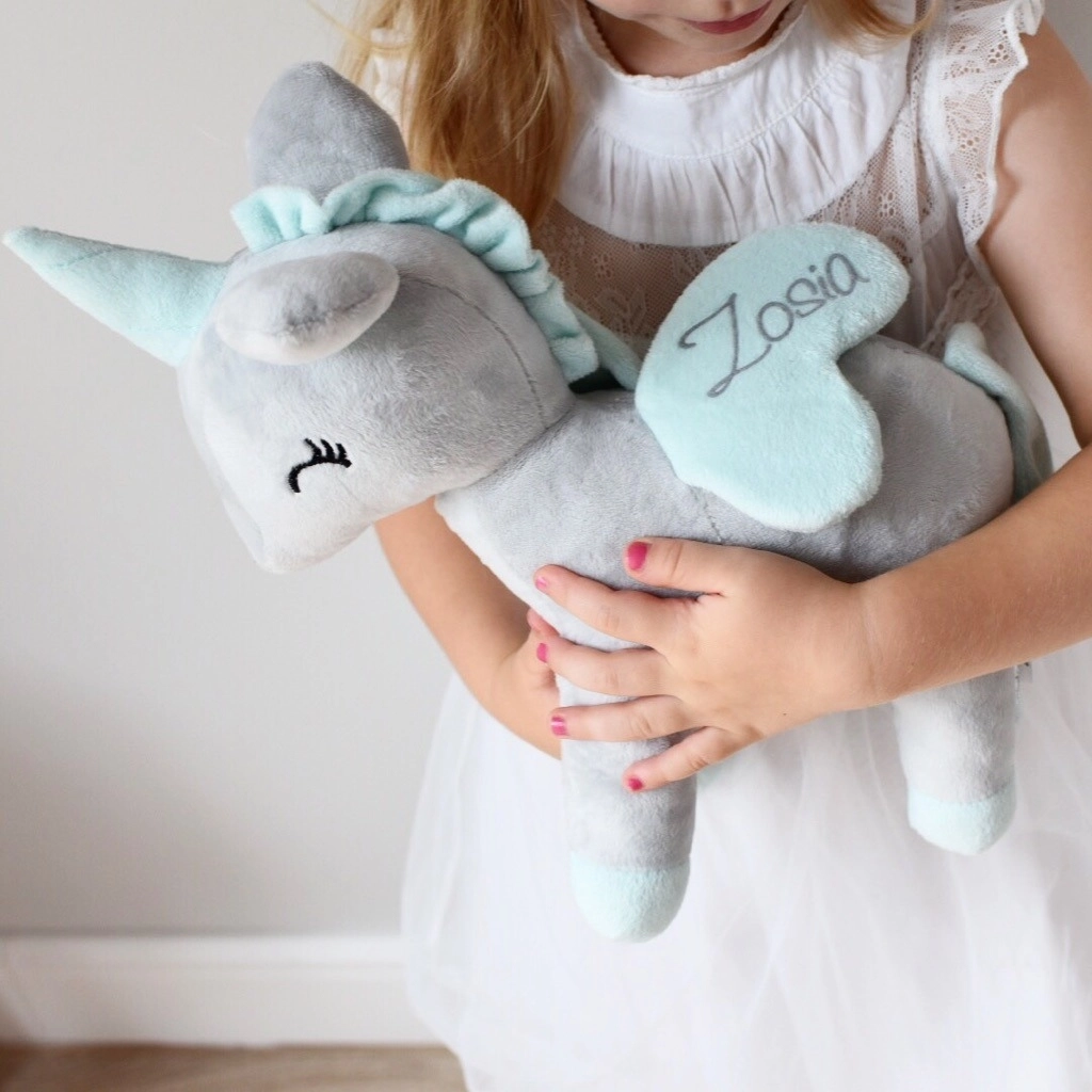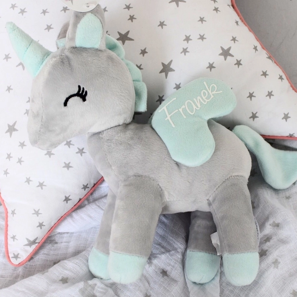 Jednorożec może zostać na życzenie spersonalizowany. Imię umieszczane jest na skrzydełku. Jeśli wybiorą Państwo opcję z imieniem należy w okienku wpisać treść napisu oraz wybrać jego kolor.