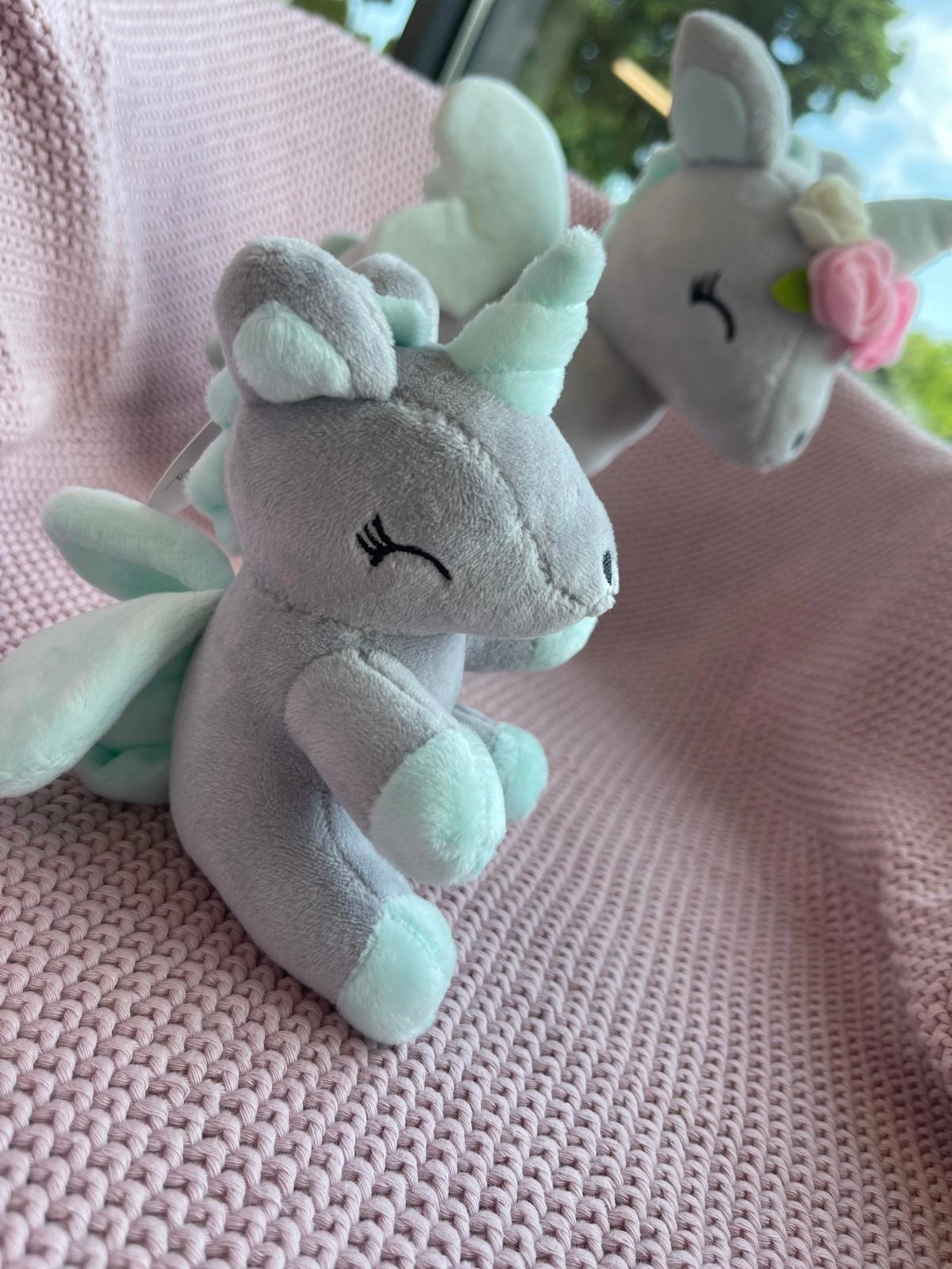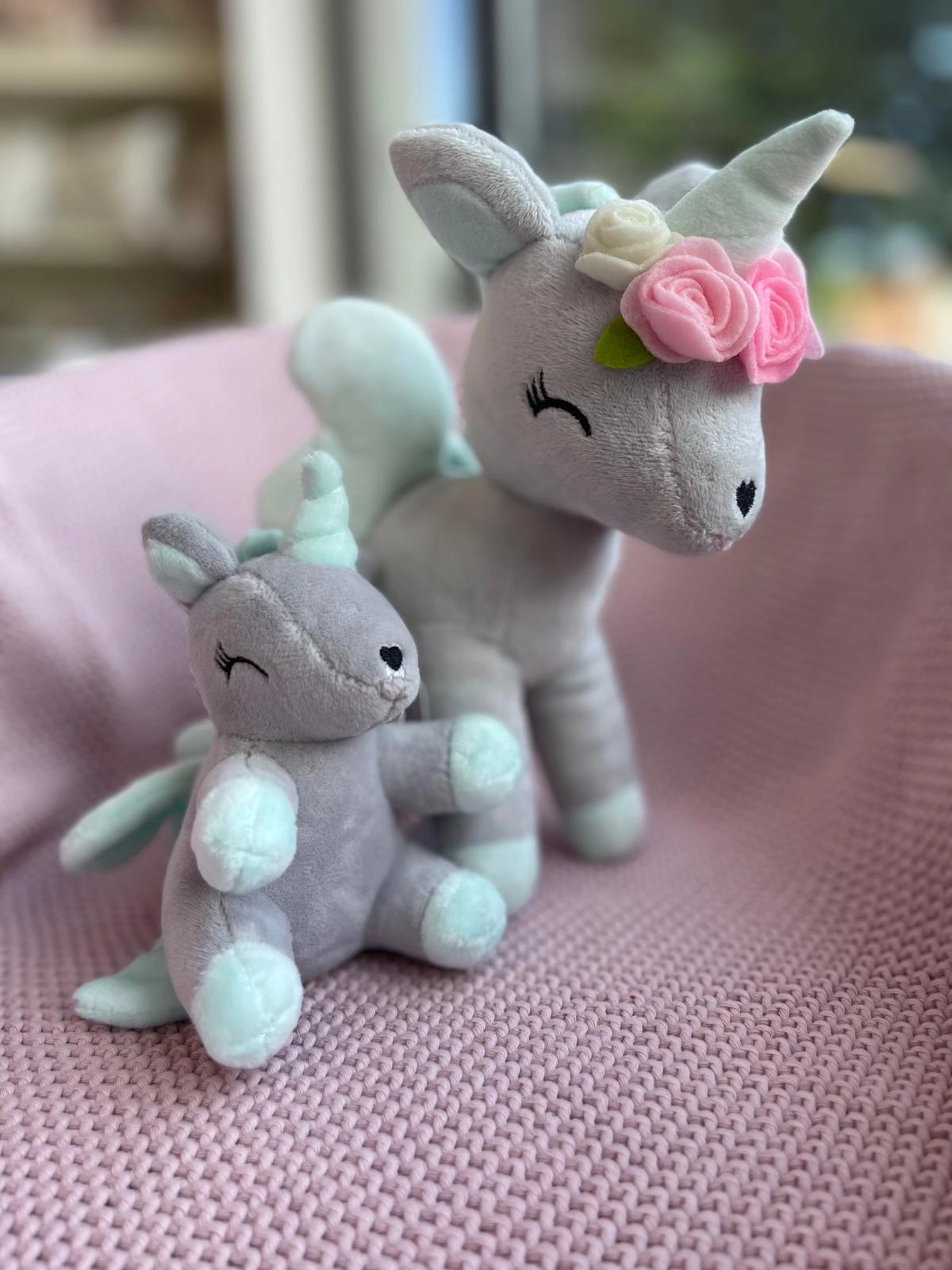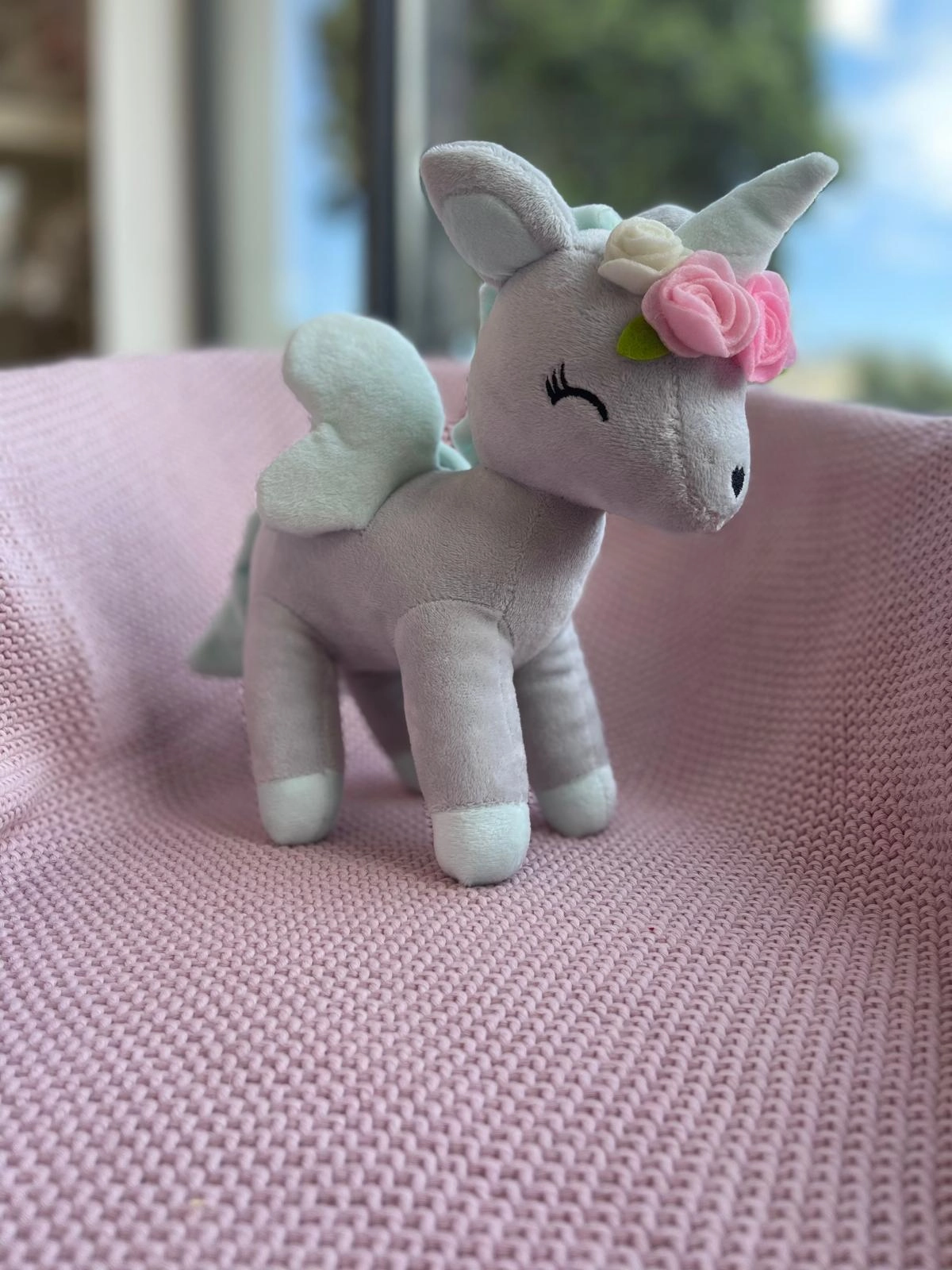 Pluszowy Jednorożec z wianuszkiem rozmiar M- Szaro/miętowy